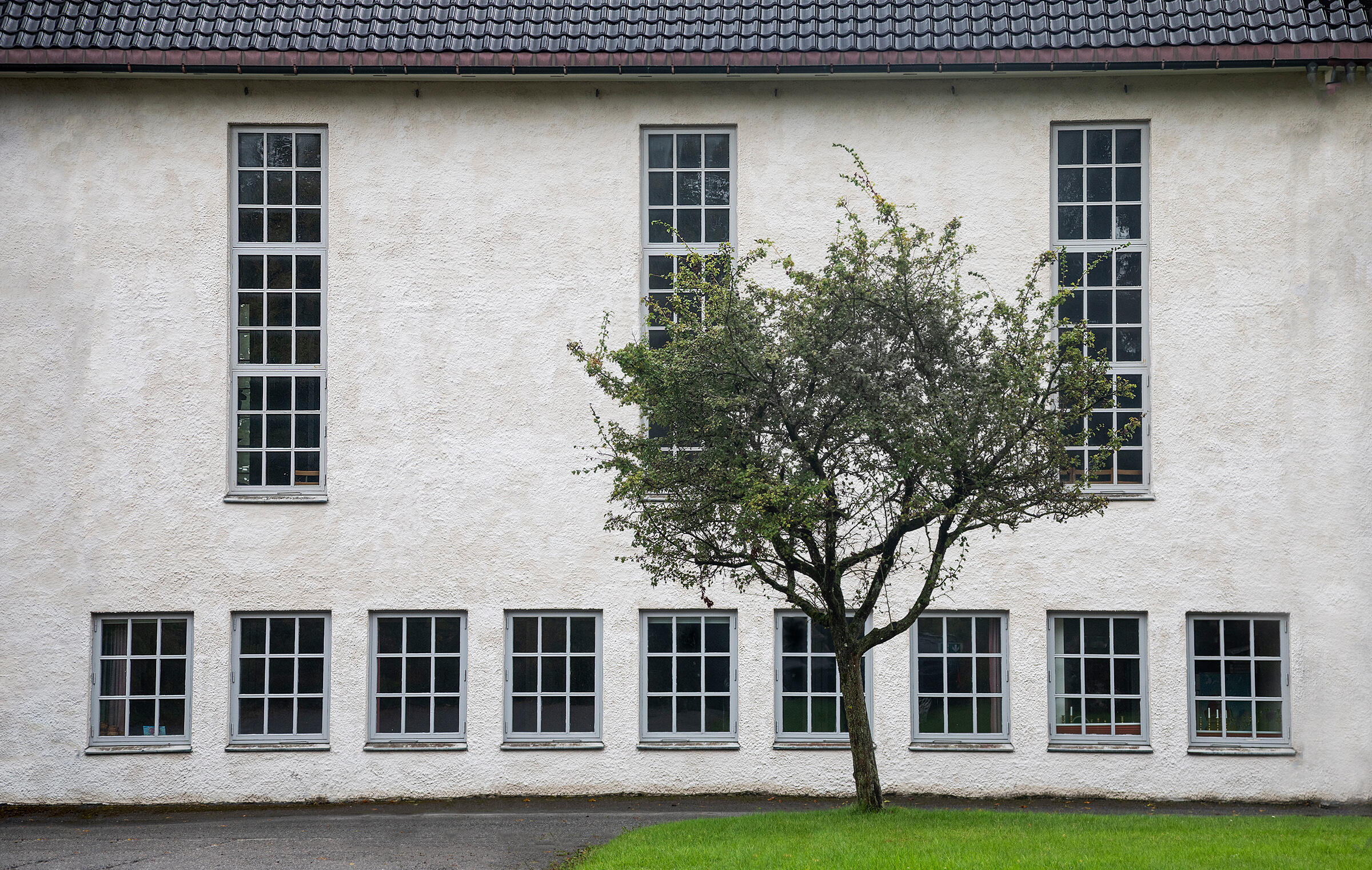 En fin og symmetrisk komposisjon hvor treet bryter opp de strenge, rette linjene og gir bildet liv. Muligens kunne fotografen gått litt lengre til venstre og fått trestammen mellom vinduene.