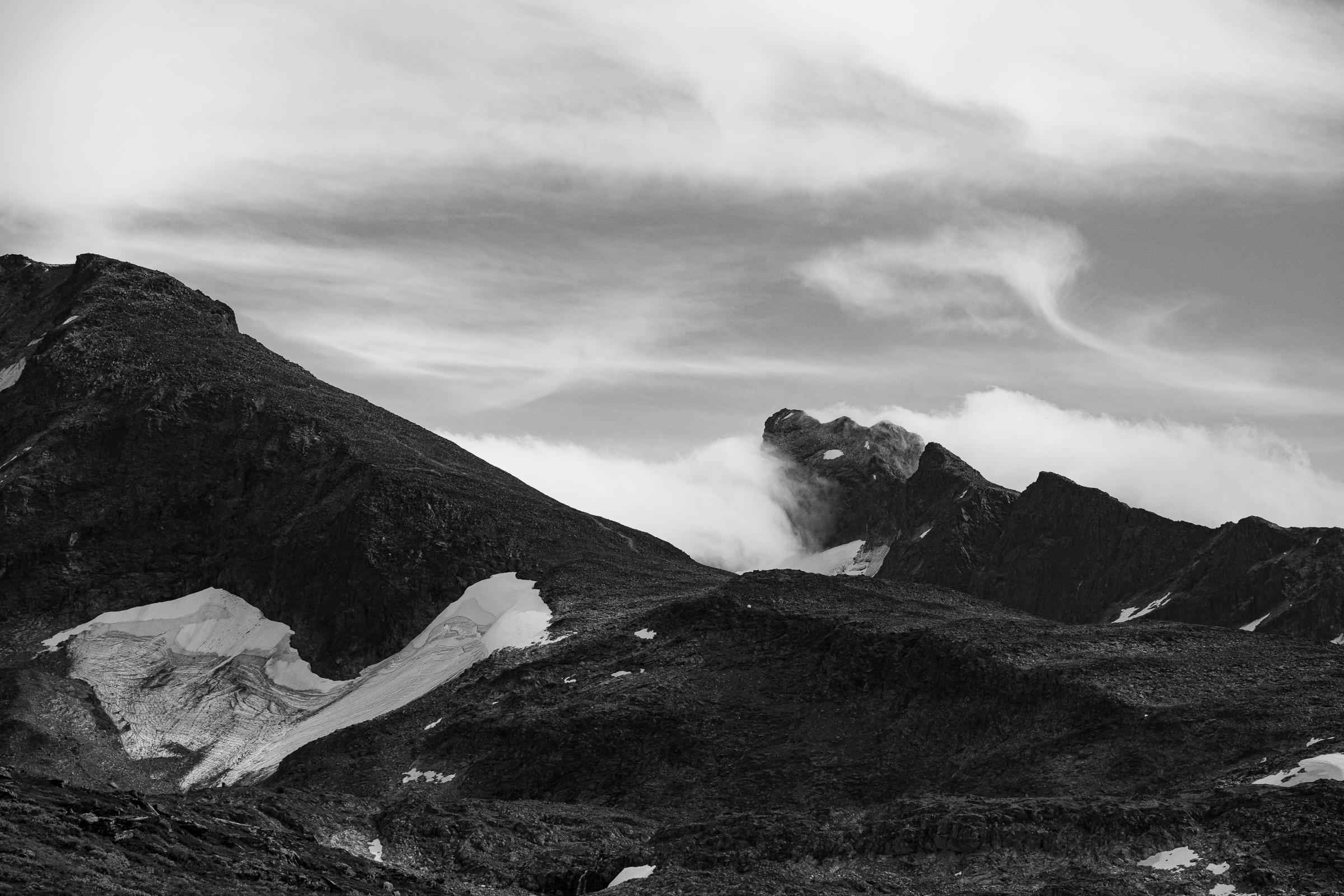 Fint landskap med skodde rundt fjella. Snøbreen er viktig element med ei fin form. Skya til høgre på himmelen har ei form som er litt beslekta med forma på breen. Kunne ha skapt endå meir dramatikk igjennom bildebehandlinga.