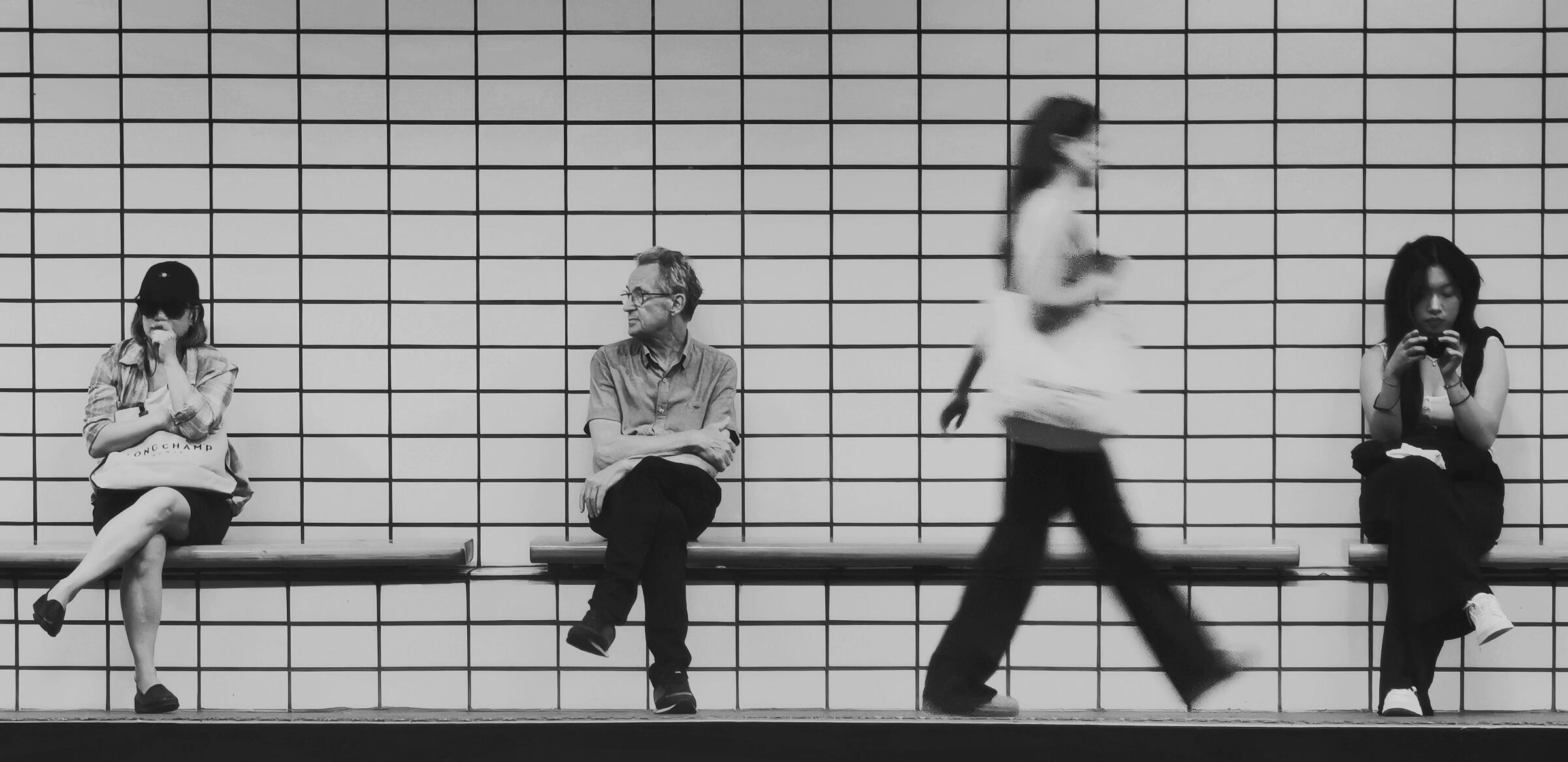 Klassisk gatefoto, der hovedmotivet rammes fint inn mellom de som sitter. Bra utført.