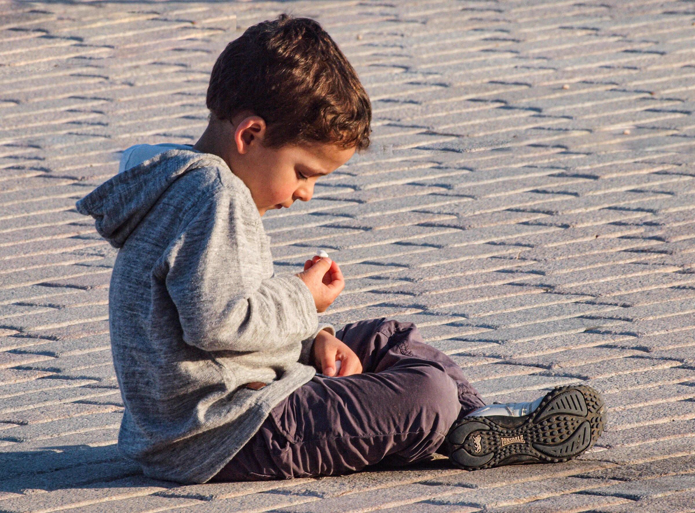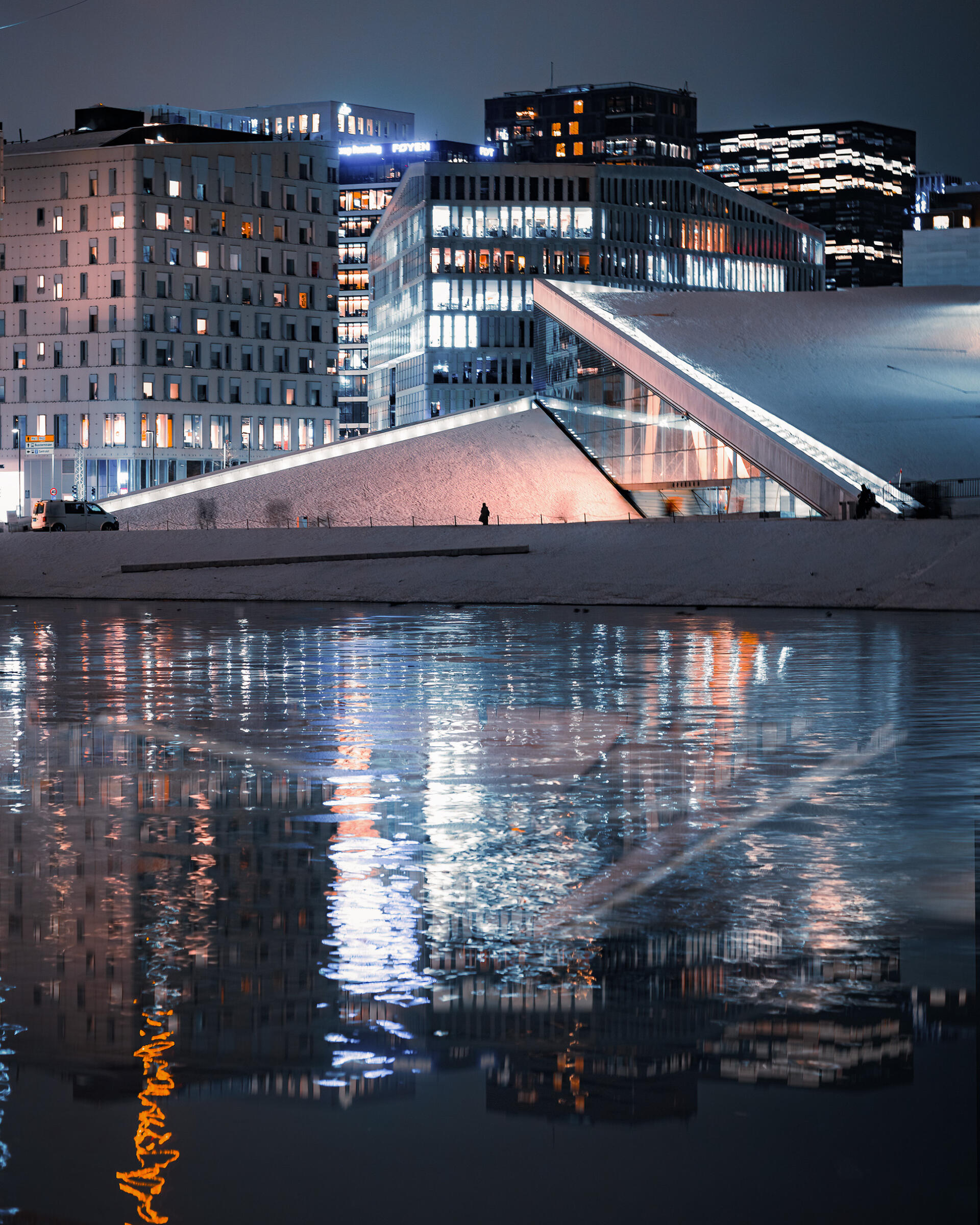 Fin oppdeling av bildeflaten. Kryssende linjer/skygger gjør at personen oppleveves enda mindre enn den er. Gjør seg veldig bra i et grafisk s/h uttrykk.