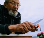 Han nyter årets første nysaltede laks. |
